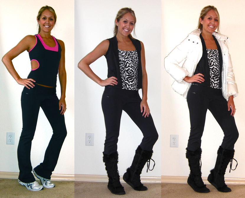 How I did it: This look is perfect for days when you didn’t sweat a lot and are running out the door. Just throw on a hooded sweater over your shirt (way cuter than a hooded sweatshirt) and switch out your gym shoes for some fuzzy boots. You instantly look comfy chic!LOOK 2