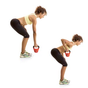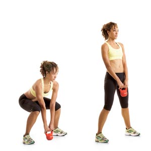 pick up the kettle bell and squeeze your glutes, strengthen your core (abs), and make sure to balance yourself on your heels